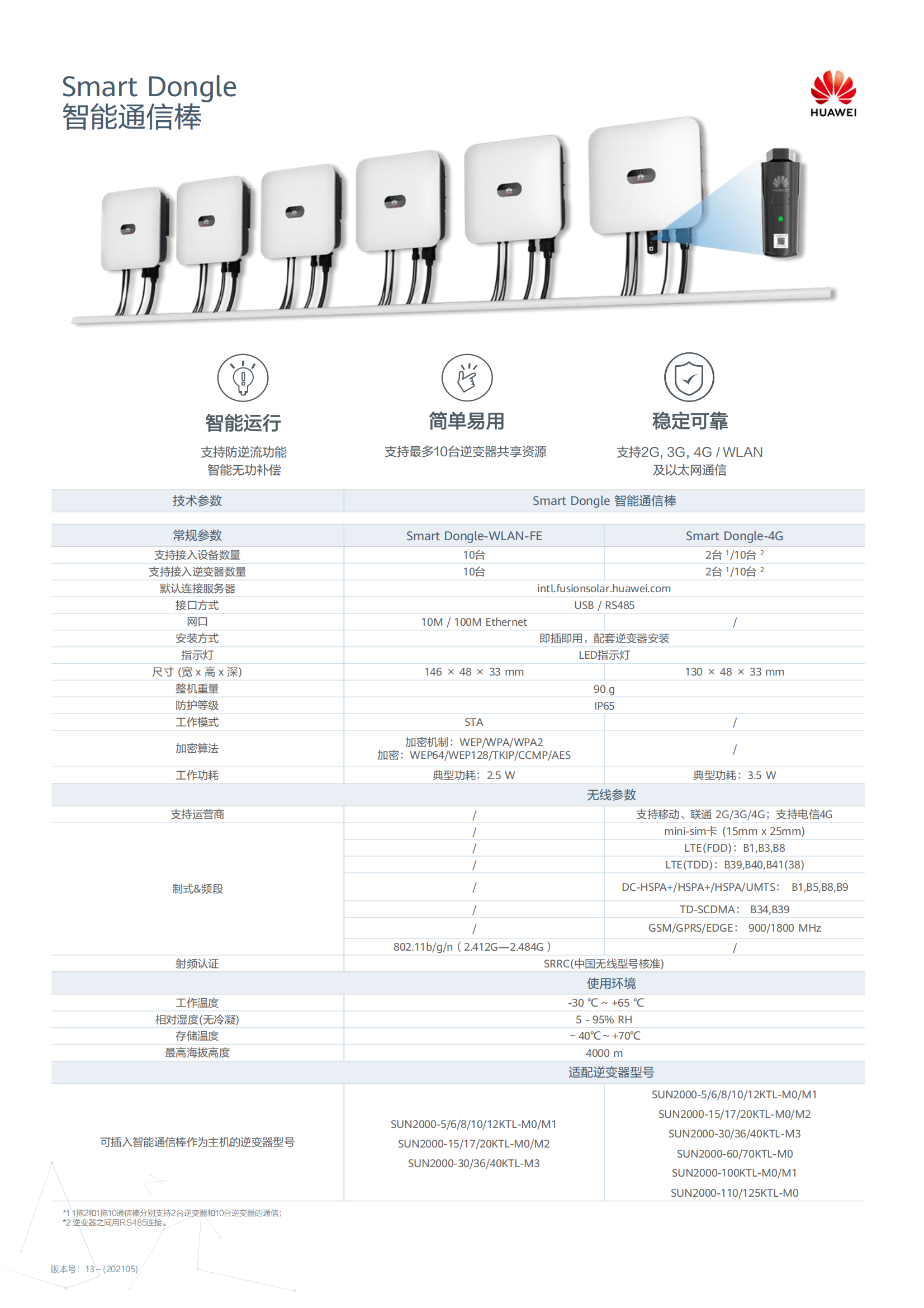 支持防逆流功能,智能无功补偿,支持最多10台逆变器共享资源,支持WLAN及以太网通信。